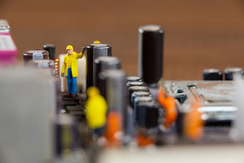 Elektrostatische Entladungen sind heimtückisch. Erde dich, nutze antistatische Unterlagen und sichere Ausgänge mit Widerständen. Verwechsle niemals Plus und Minus. Eine kleine Routine spart teure Schäden. Welche Schutzrituale funktionieren bei dir am besten? Schreib uns unbedingt.